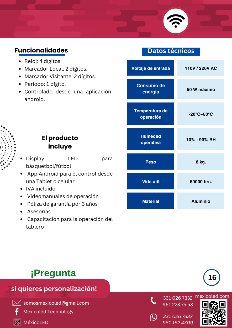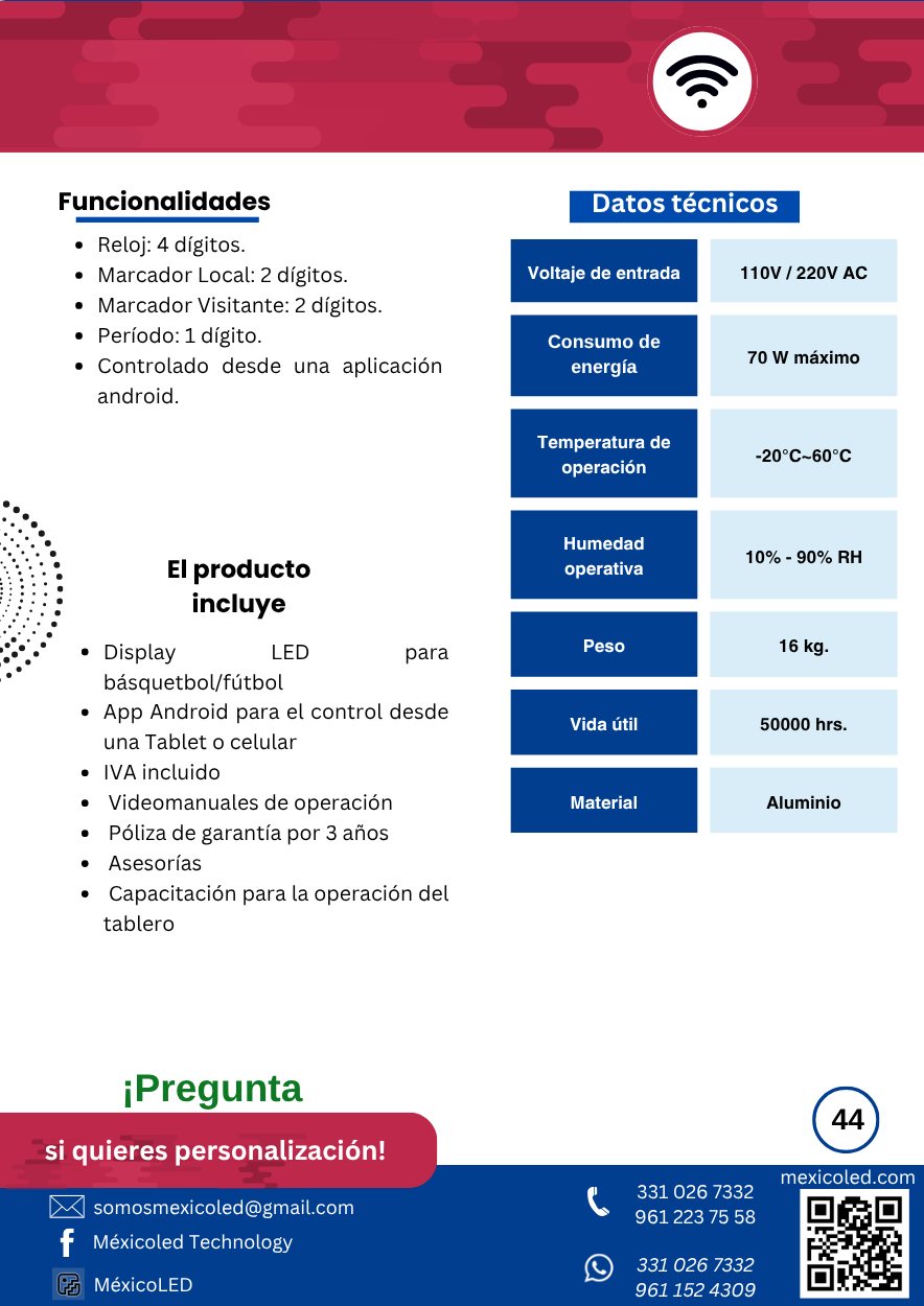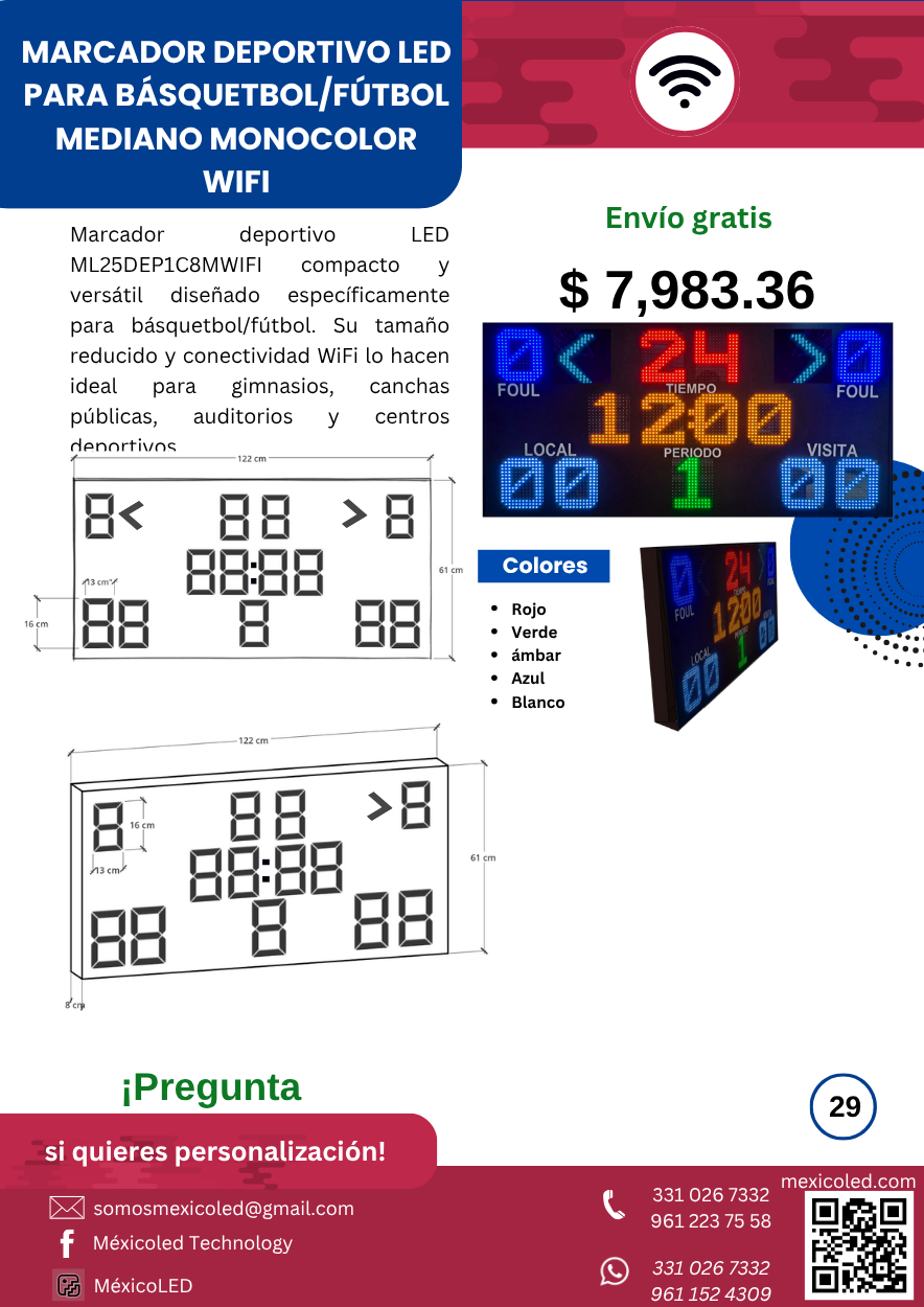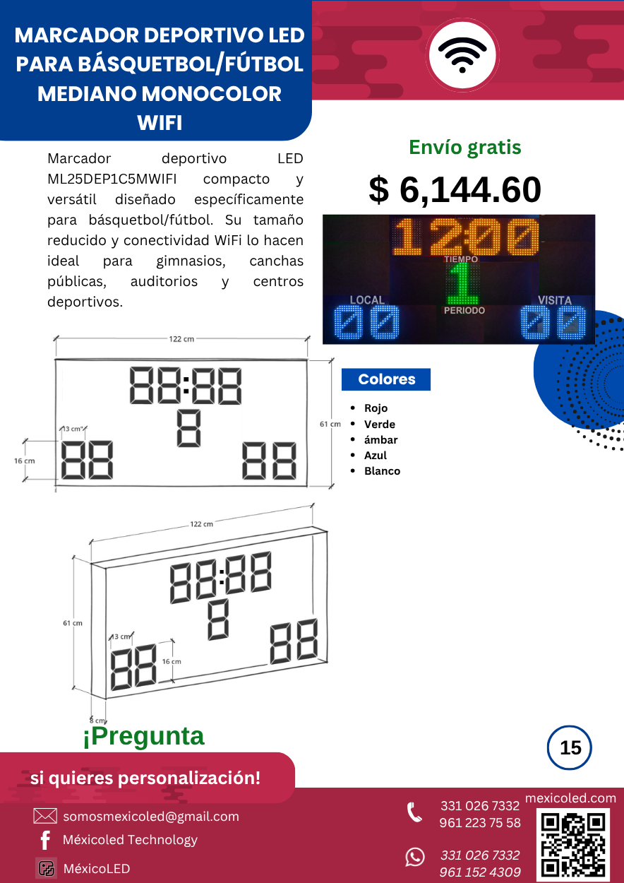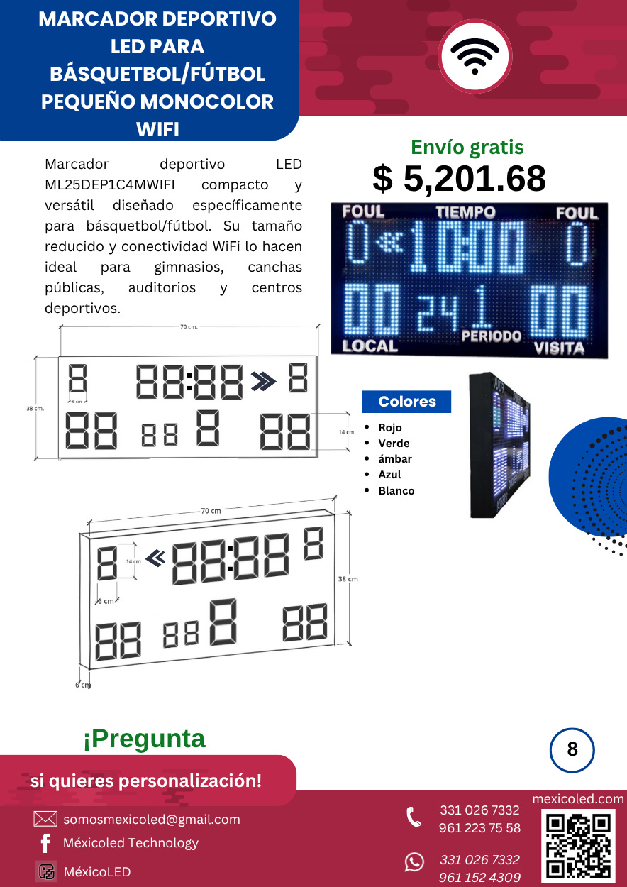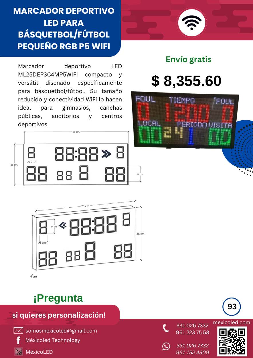 Modelo compacto ideal para gimnasios y escuelas, con dígitos rojos de alta luminosidad.