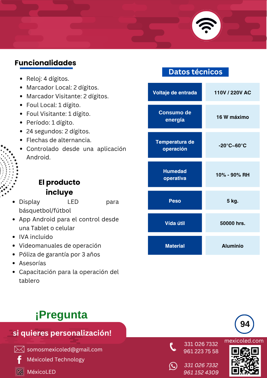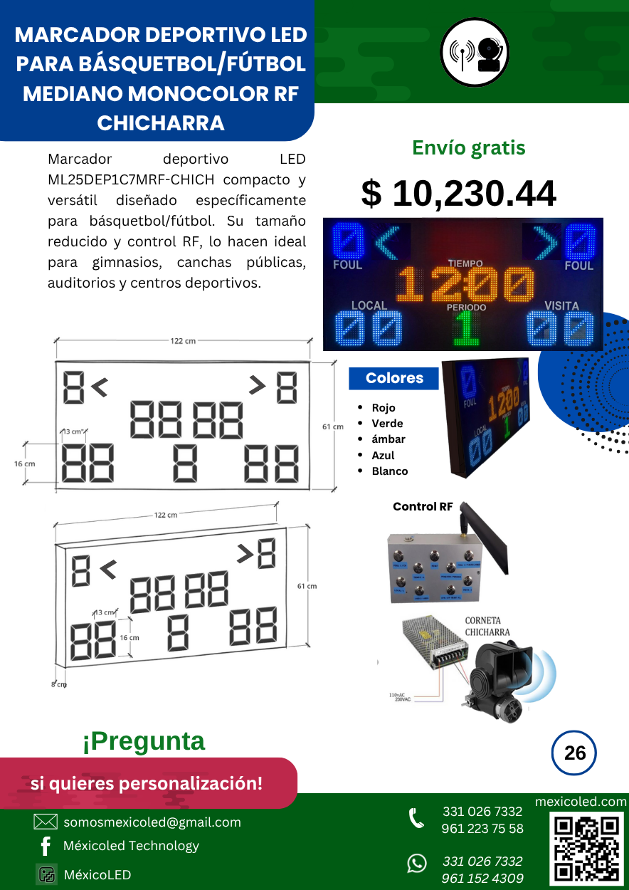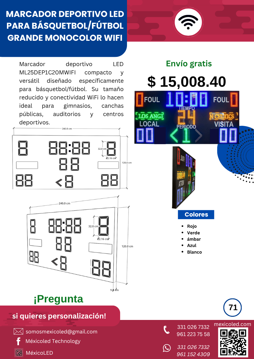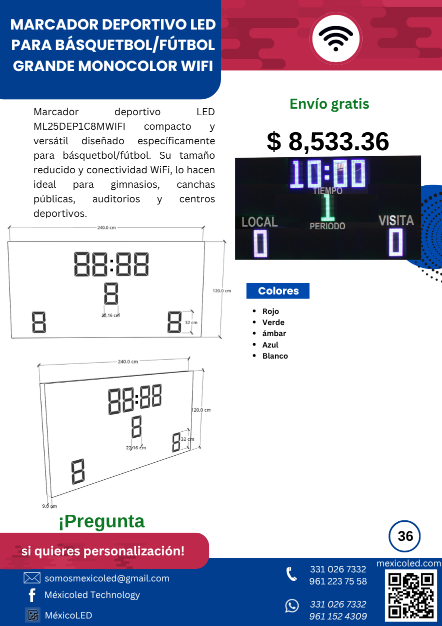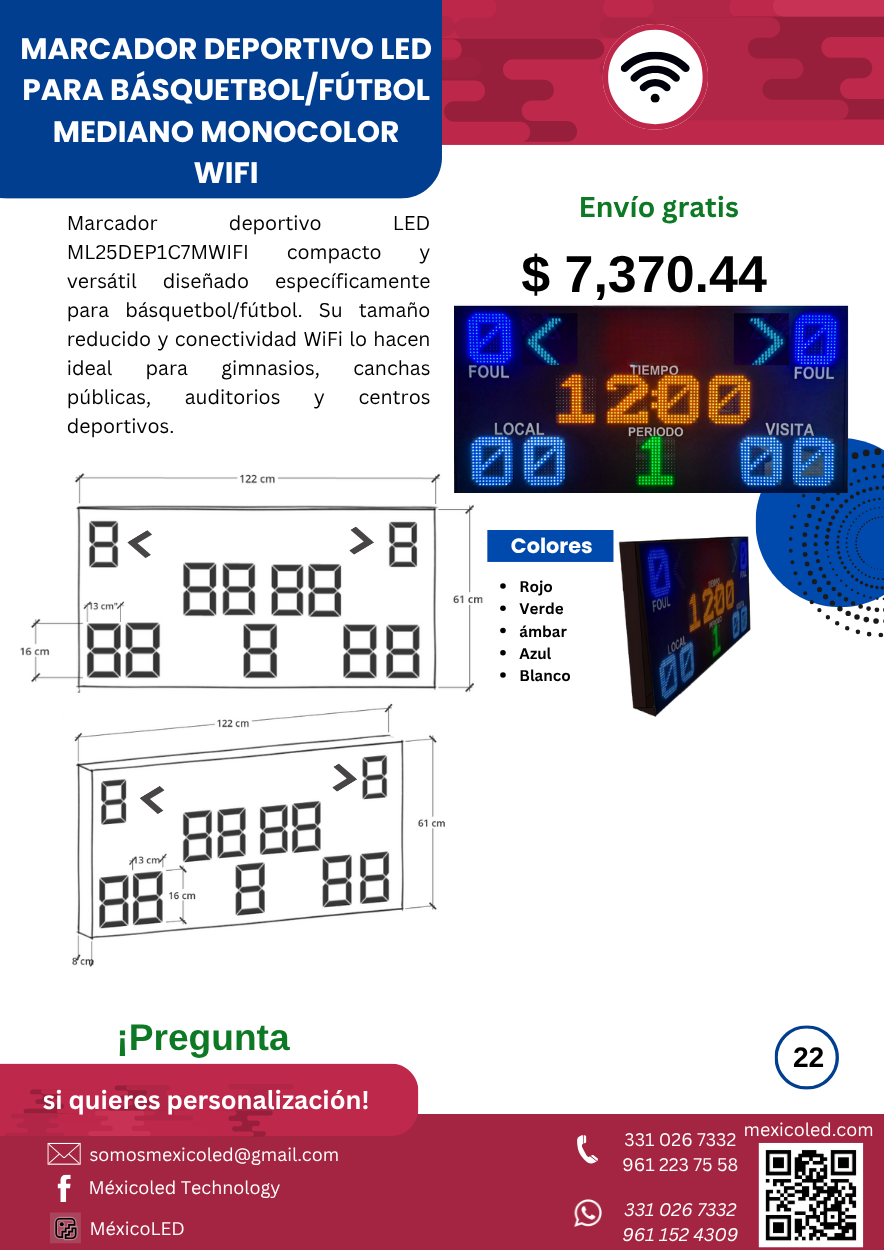 Modelo compacto ideal para gimnasios y escuelas, con dígitos rojos de alta luminosidad.