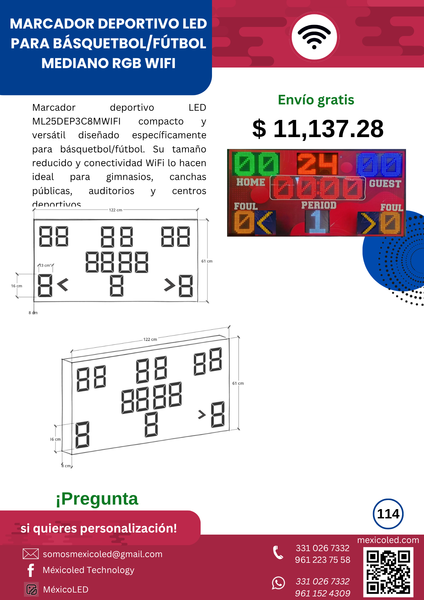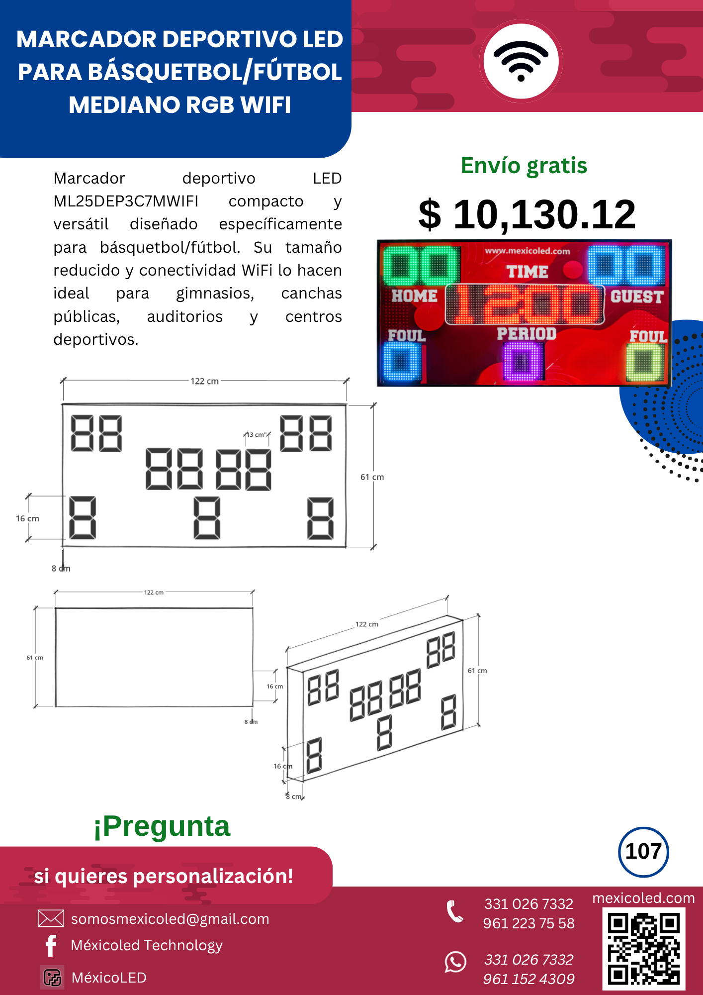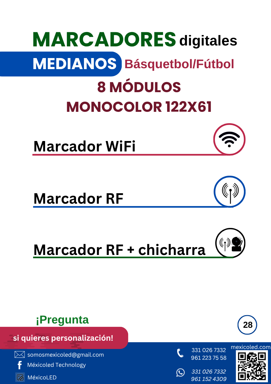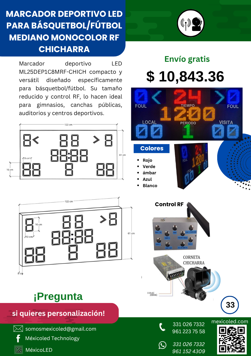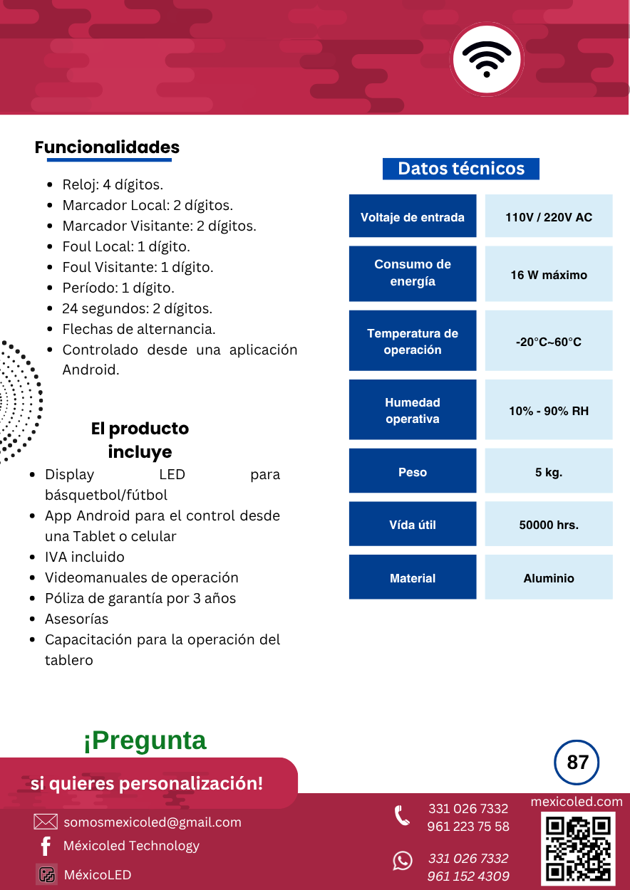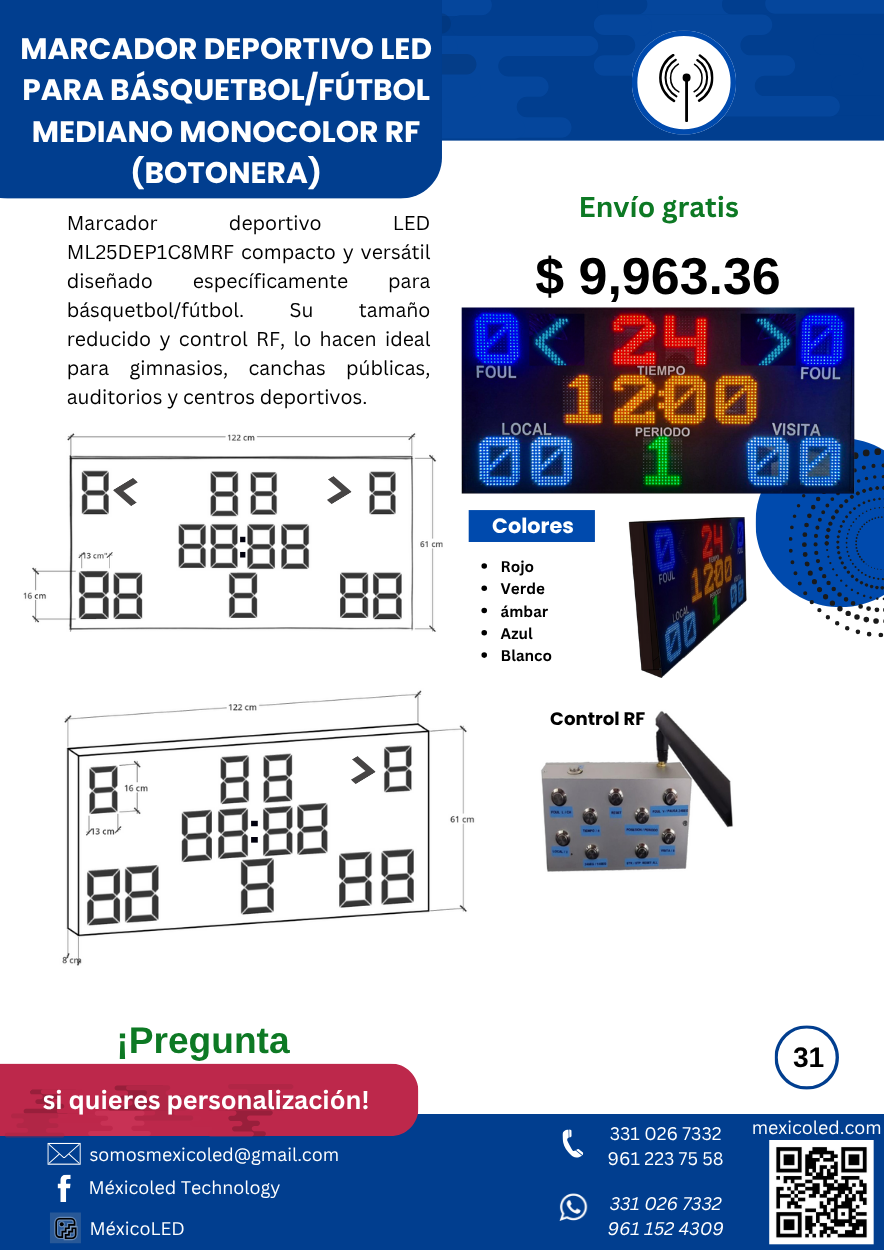 Modelo compacto ideal para gimnasios y escuelas, con dígitos rojos de alta luminosidad.