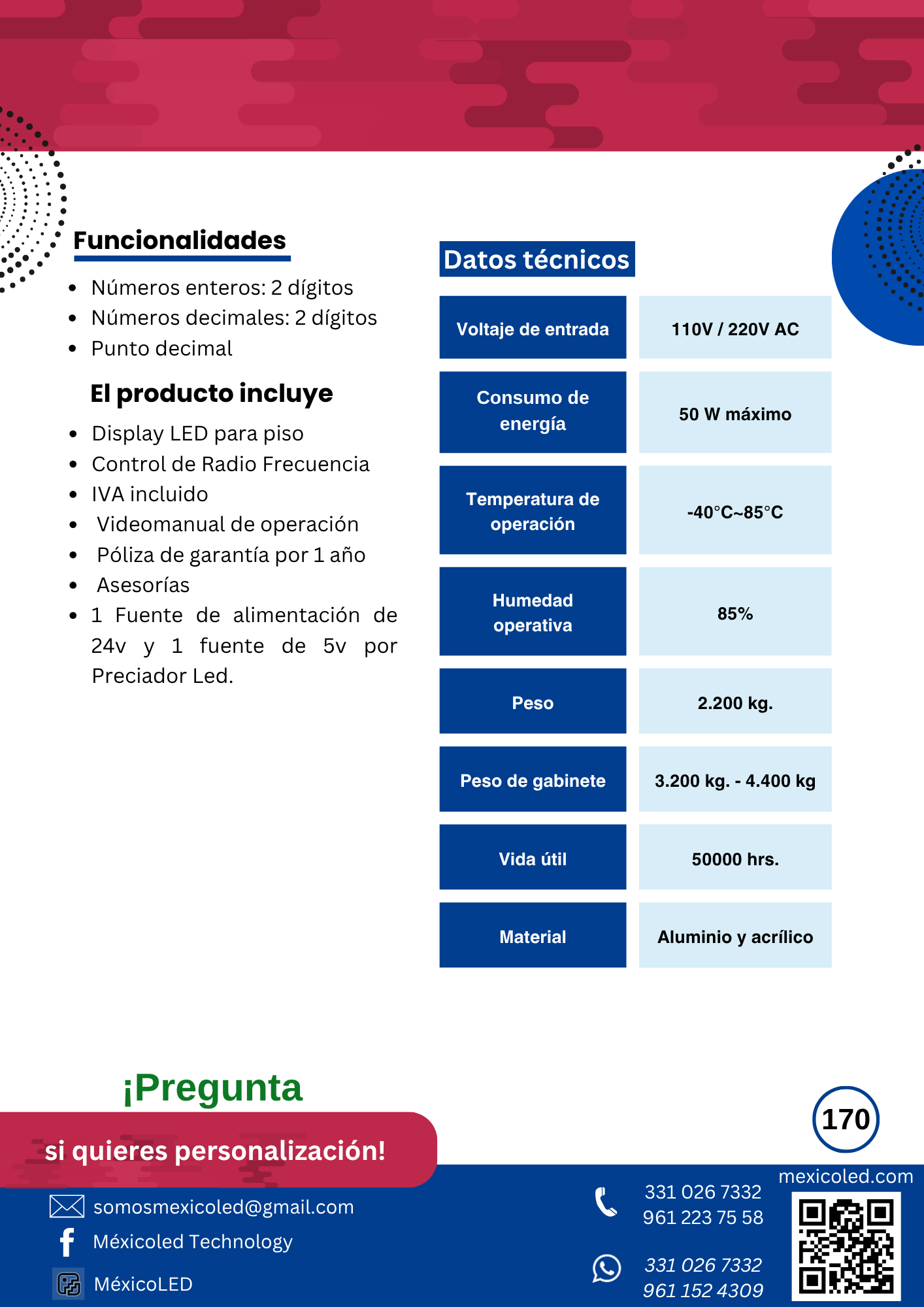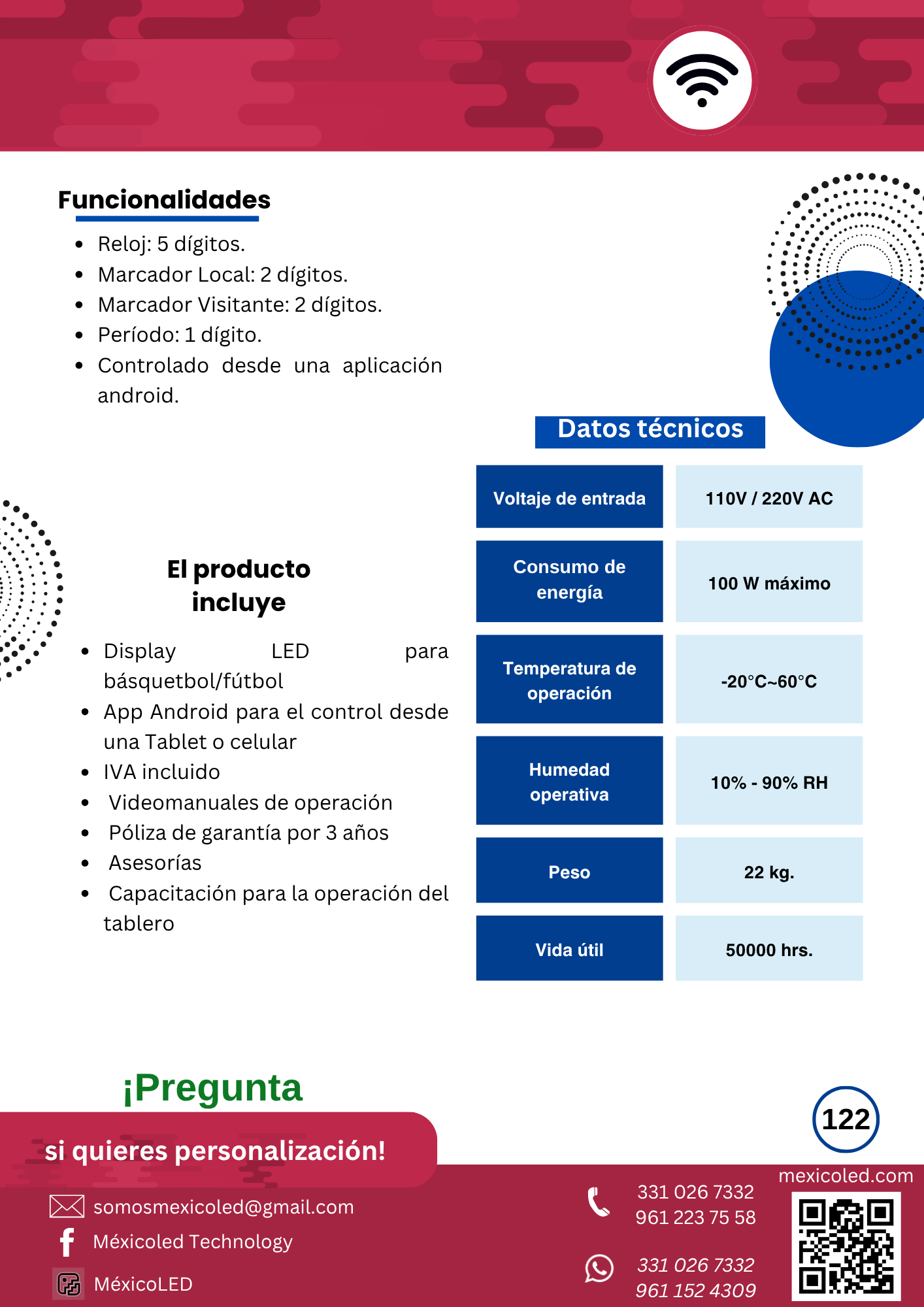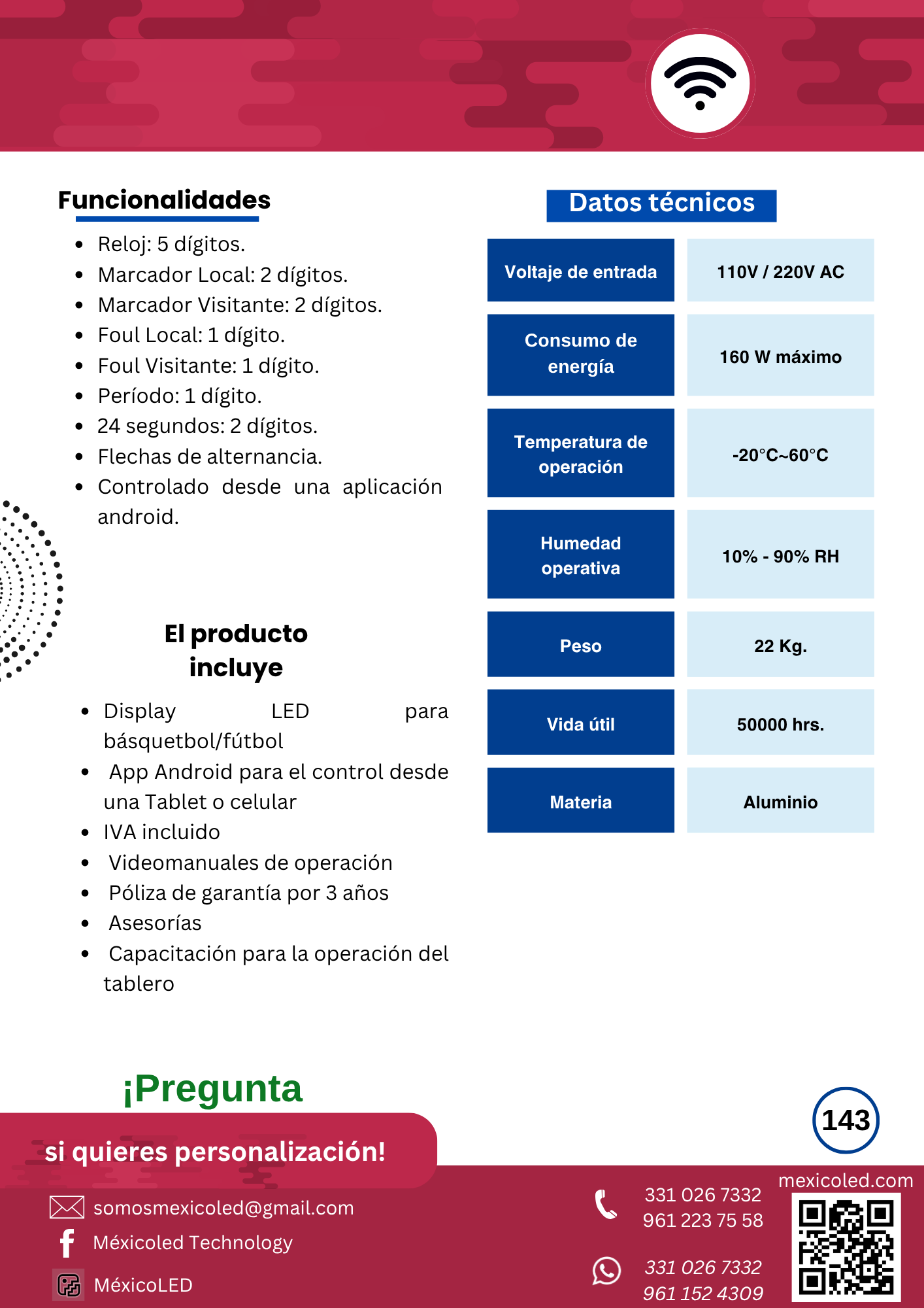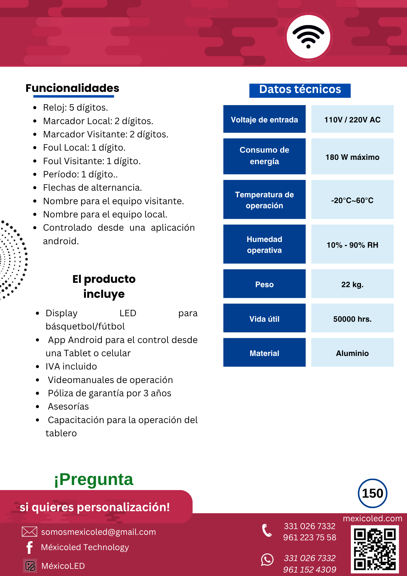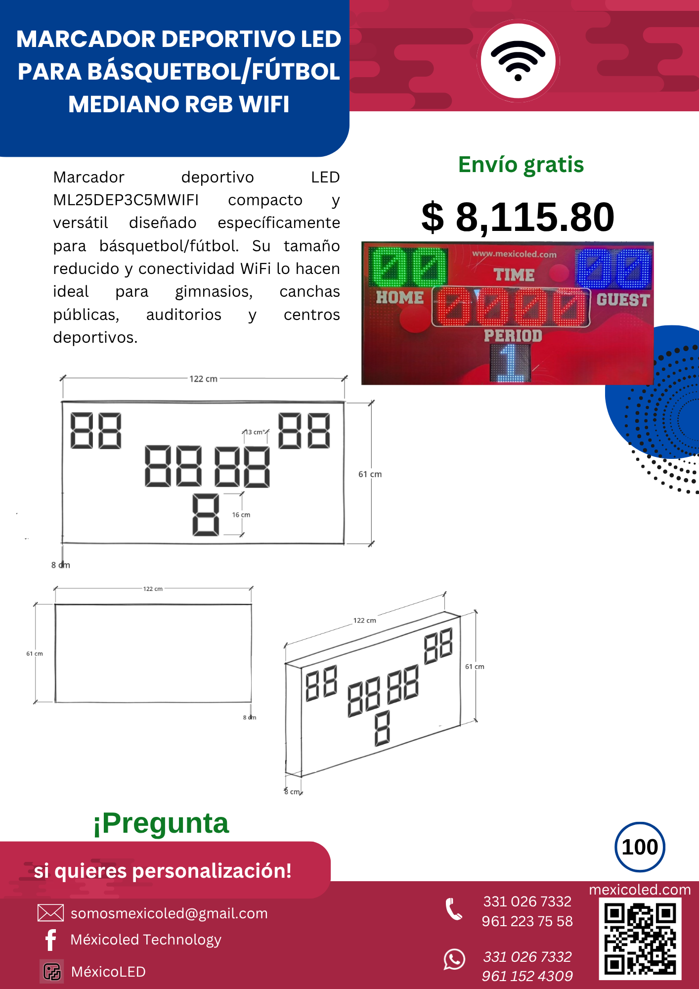 Modelo compacto ideal para gimnasios y escuelas, con dígitos rojos de alta luminosidad.